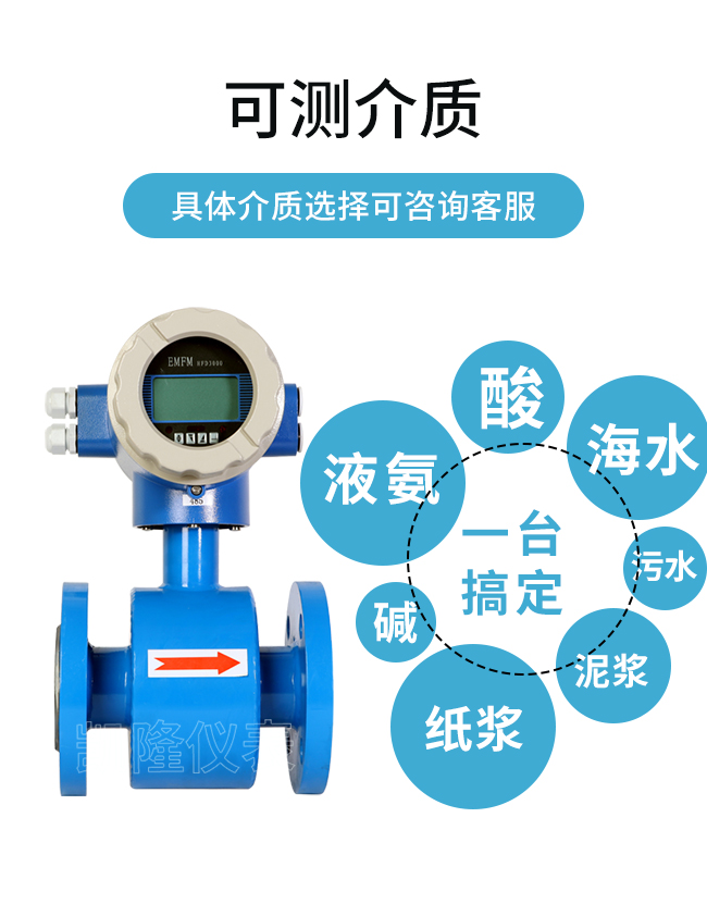 可測(cè)量介質(zhì):水、污水、鹽水、海水、空調(diào)水、消防水、循環(huán)水、硫酸、鹽酸、硝酸、醋酸、堿溶液、泥漿、紙漿、煤漿、果漿、果汁、礦泉水、飲用水、自來(lái)水、醬油、果醬、啤酒、果汁、米酒、牛奶等導(dǎo)電液體,特別適用于酸堿類有腐蝕性的液體。